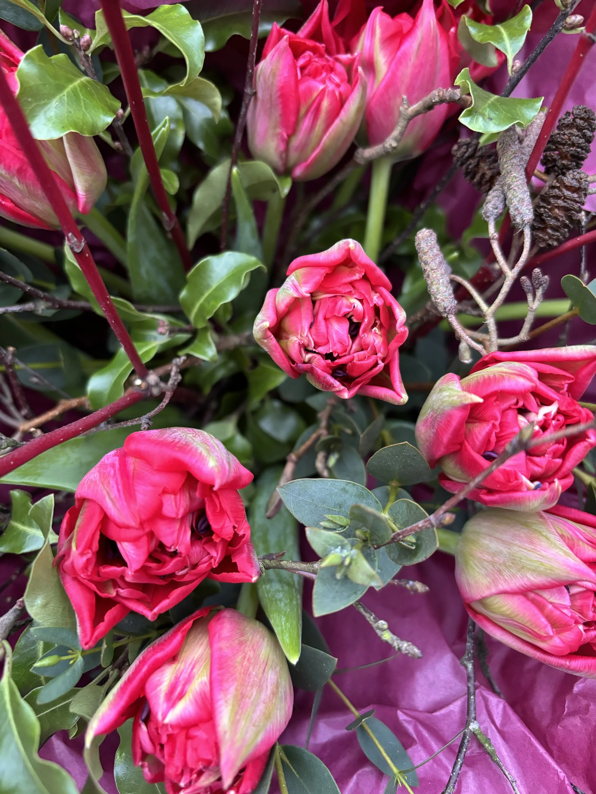 A wonderfully sustainable, British-grown and seasonal alternative to a dozen red roses. No air miles here! Each bouquet is crafted in my signature wild and romantic style, using foraged textural elements and specialist tulips from elite supplier Smith and Munson in Lincolnshire. These tulips are anything but average- they open up with multiple petals, making them similar to a rose or peony.
